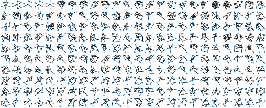 The other day I was homeschooling my kids, and they asked me: “Daddy, can you draw us all possible non-isomorphic graphs of 3 nodes”? Or maybe I asked them that? Either way, we happily drew all possible graphs of 3 nodes, but already for 4 nodes it got hard, and for 5 nodes - plain impossible!